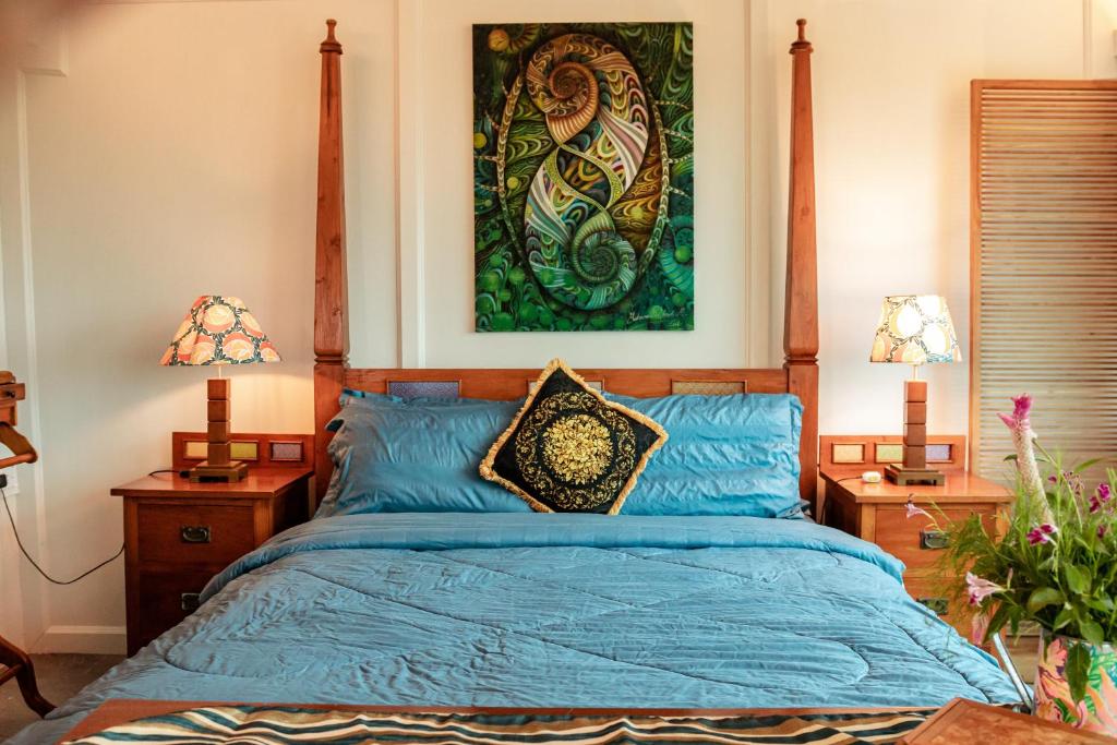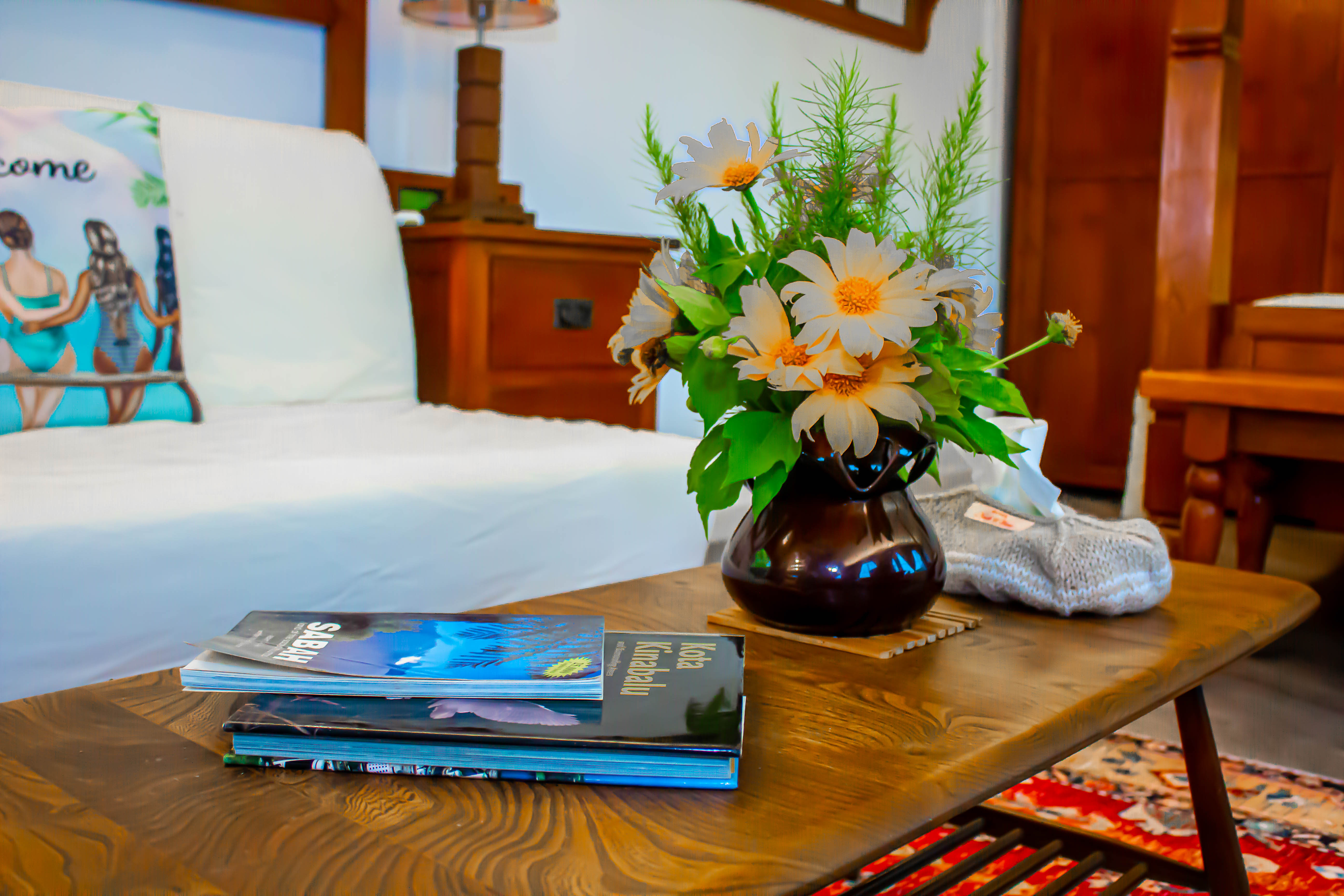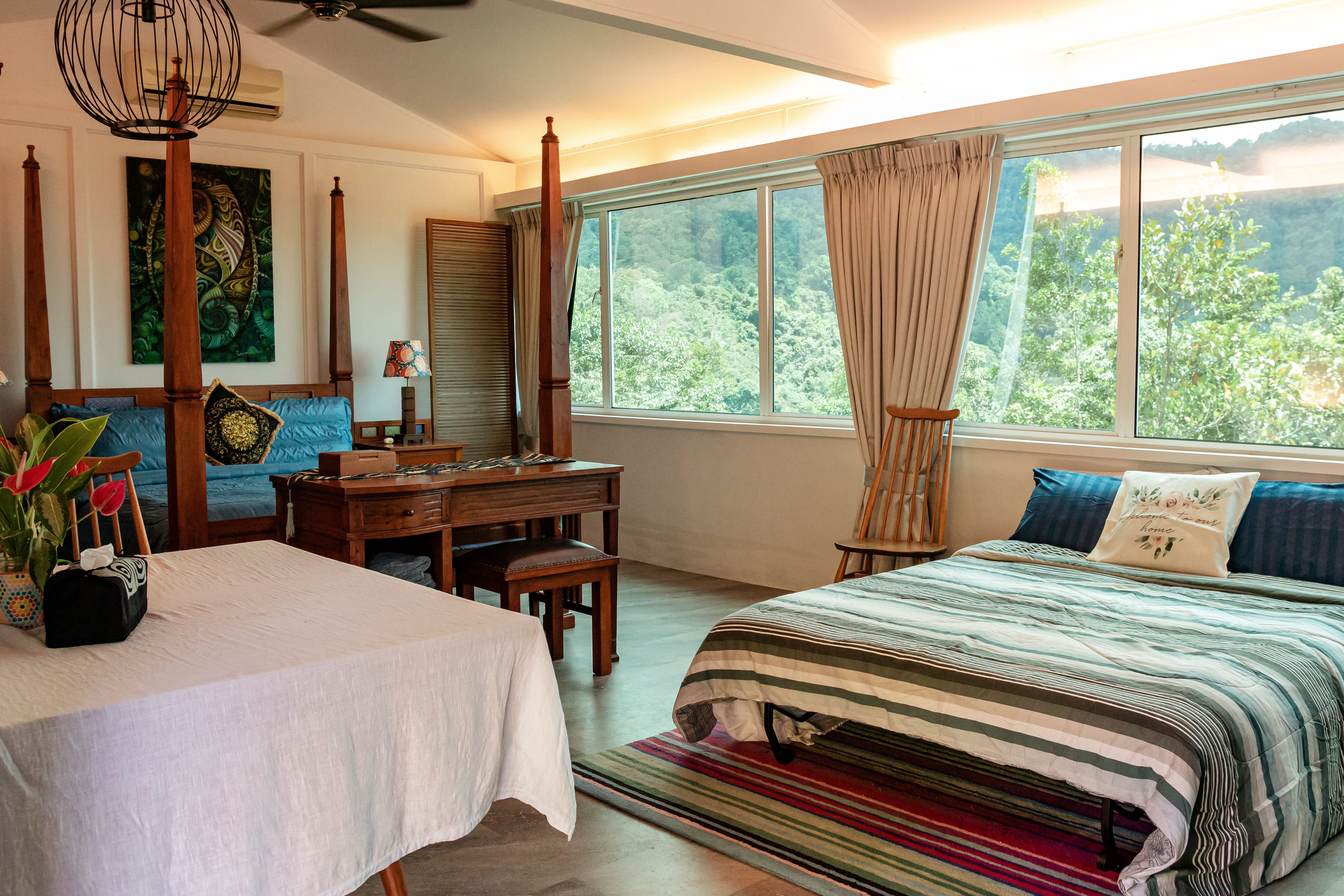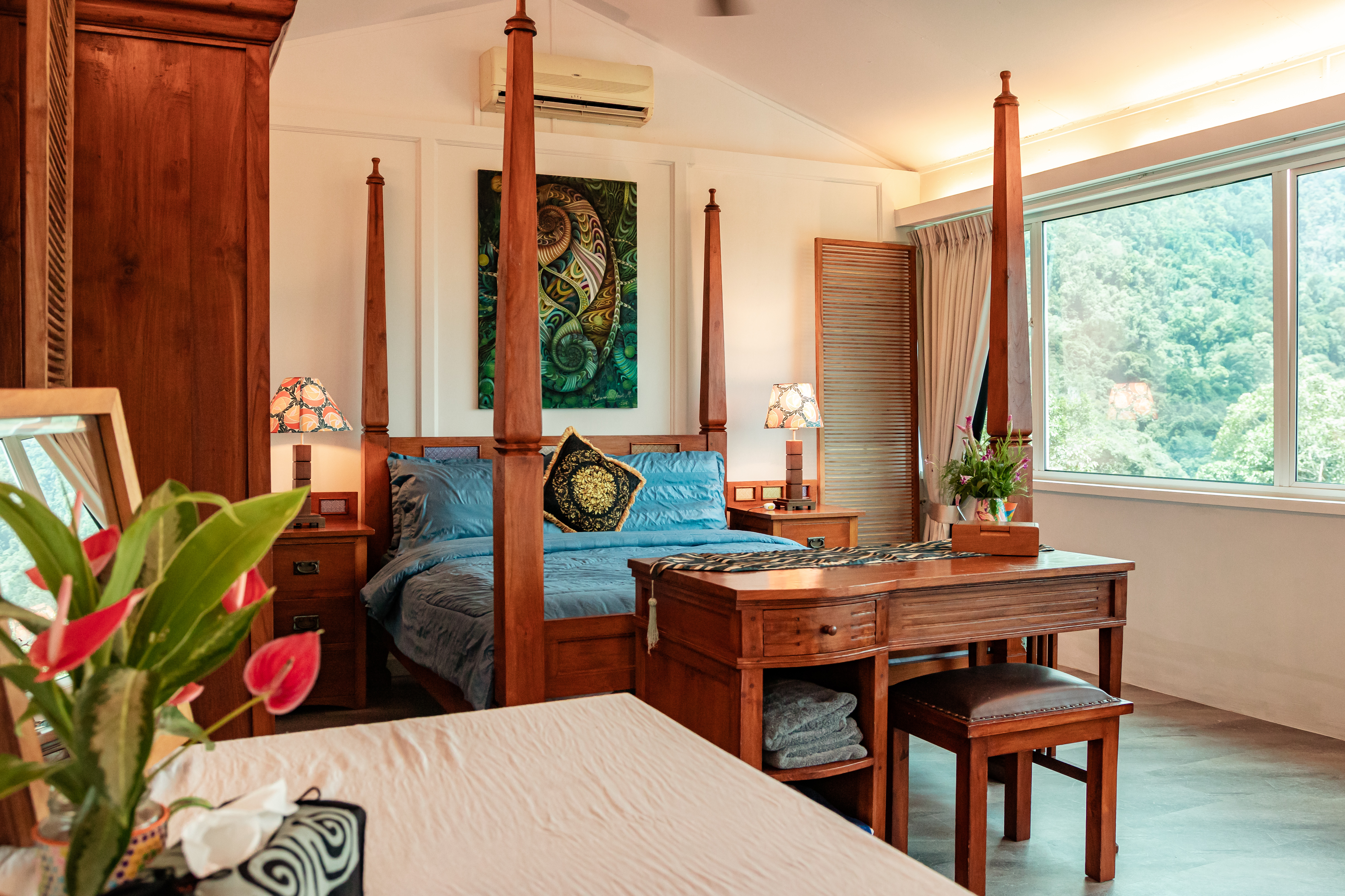 Sinurambi is situated on the boundary of the Crocker Range National Park. The full-width panoramic windows of "Forest View" span the valley and look directly into the depths of the Rain Forest Reserve, undisturbed for a million years. It's simply awe inspiring. The room boasts a king size four poster bed and modest collection of Batawi Dutch period teak furniture. Ceiling fans and air conditioning keep you comfortable and a comprehensively equipped kitchen is there for you to prepare the most elaborate meals. Paintings around the room are by local artists and the flowers from our garden.