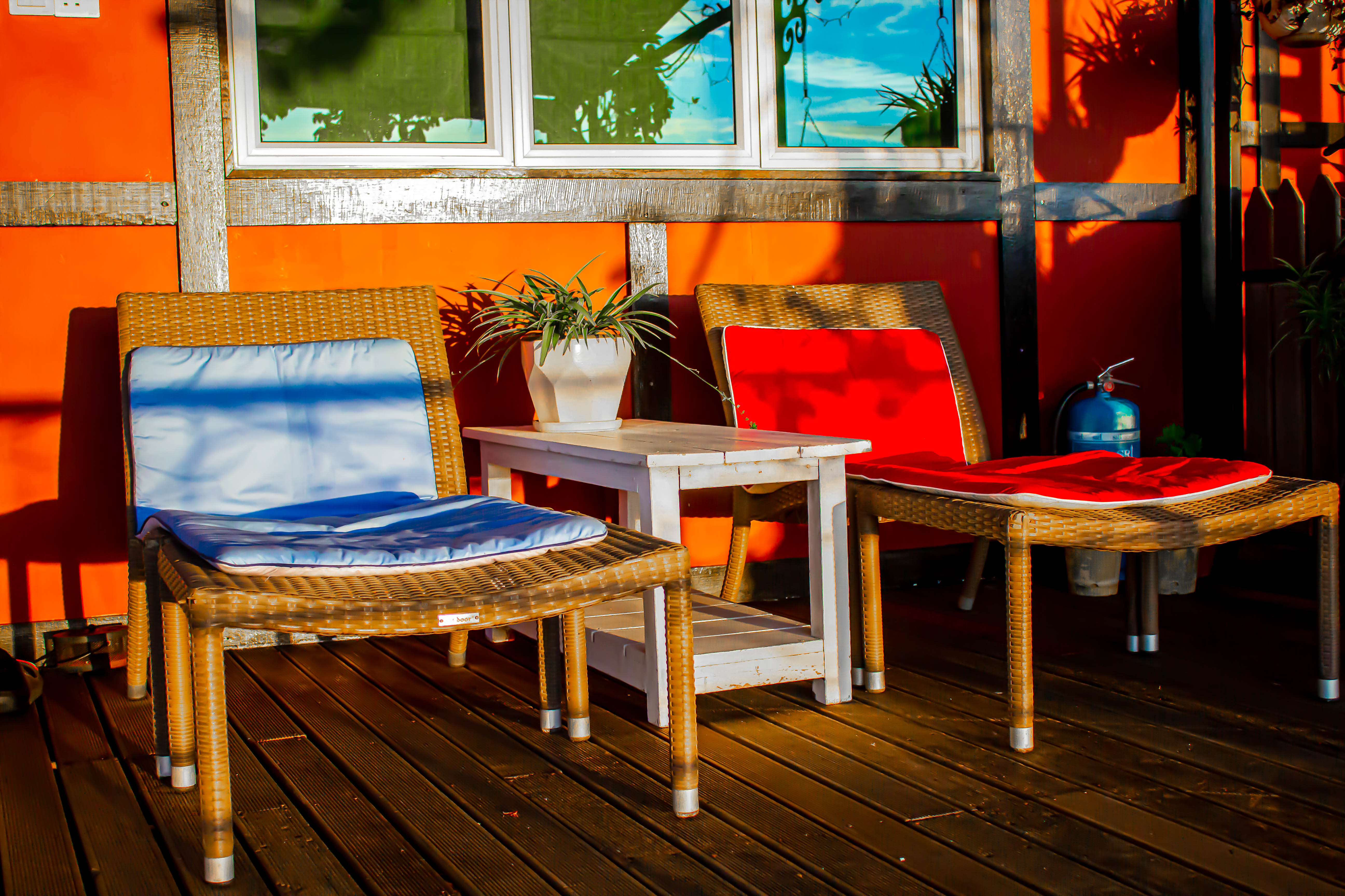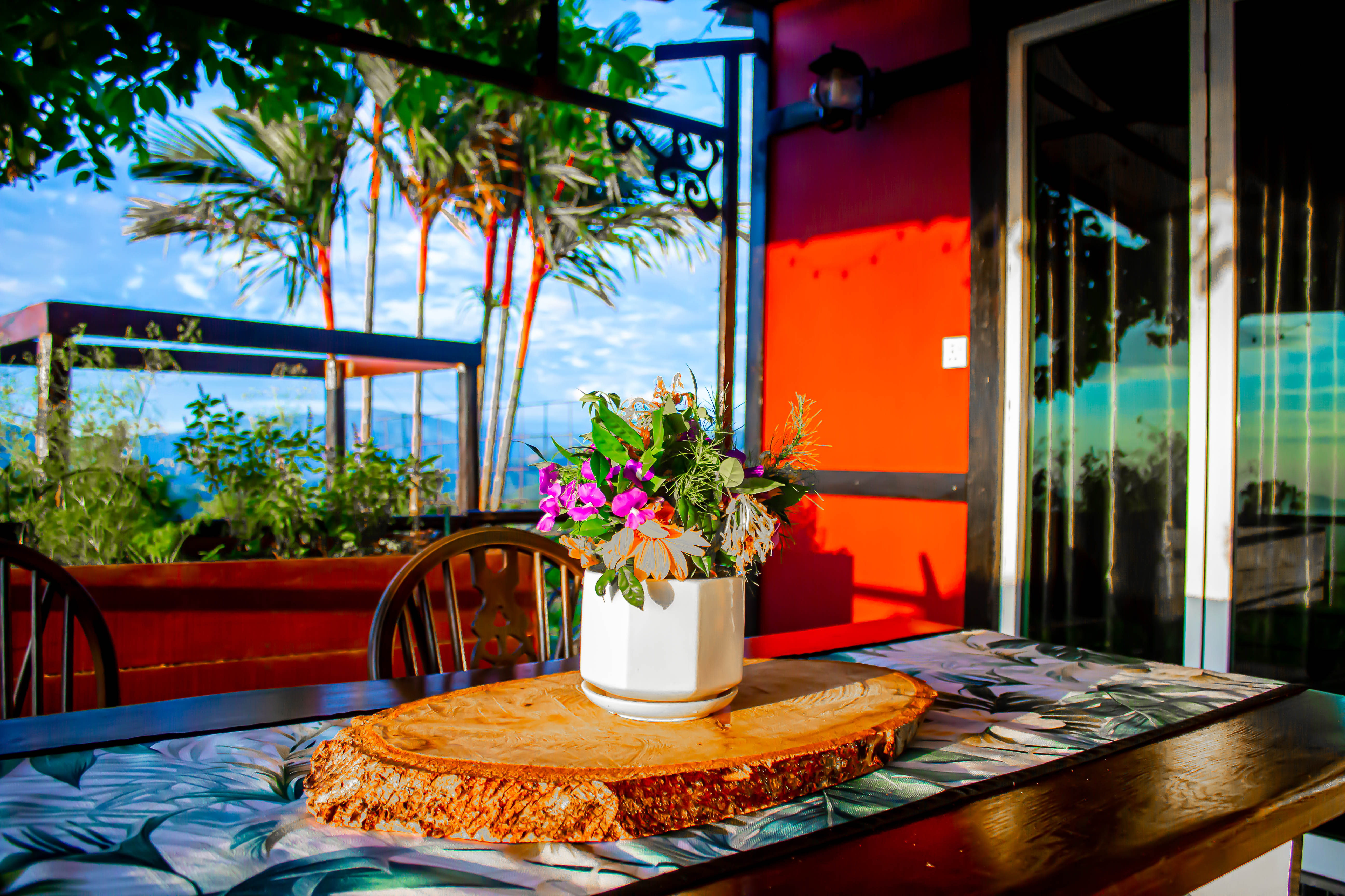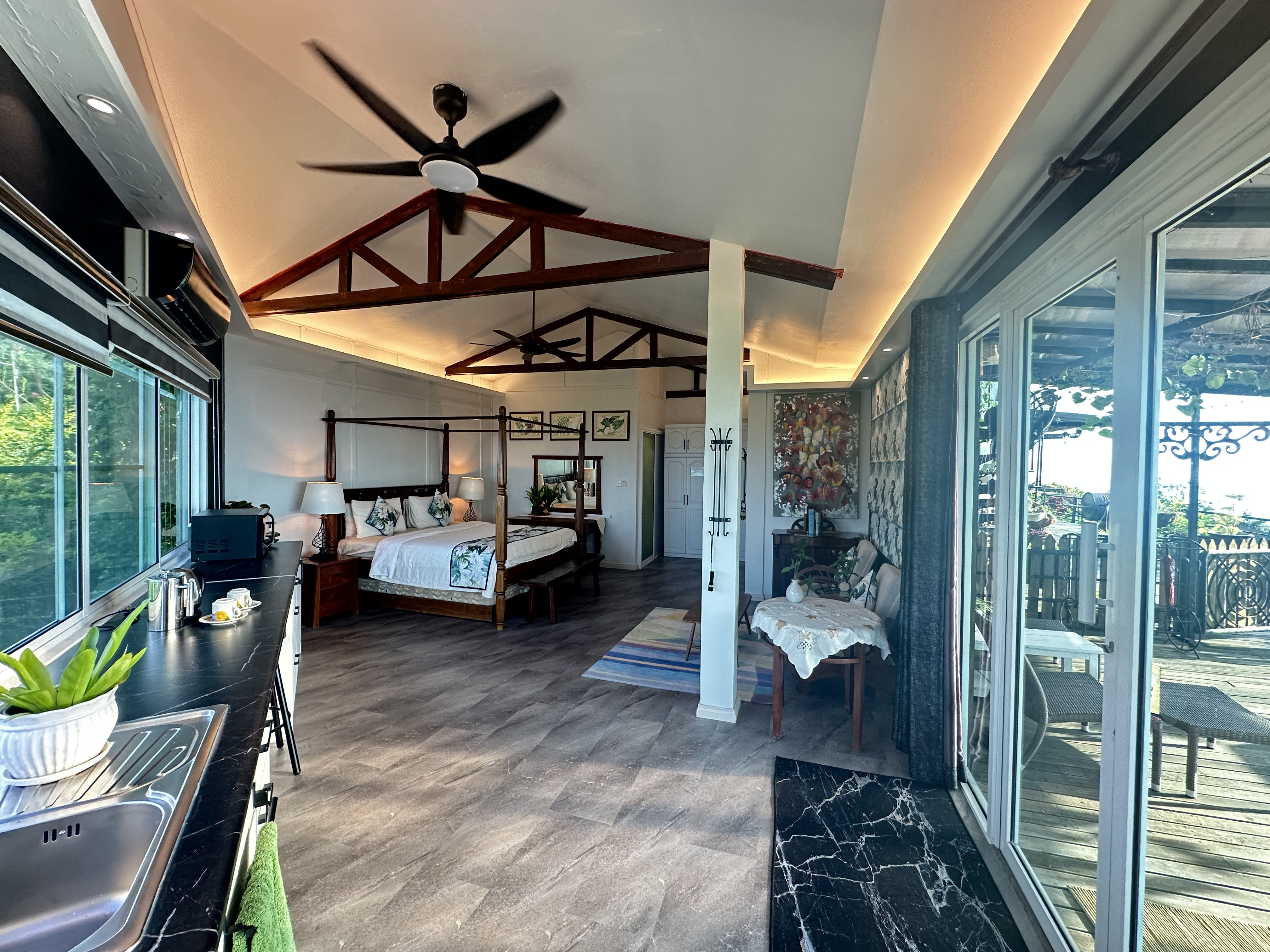 The Kinabalu Room has a commanding view of Mount Kinabalu. Watching the sun rise from behind the mountain at dawn whilst sitting on your private balcony and sipping your first cup of coffee is an experience you will never forget. The room's four poster bed is something to behold. It is simply massive and eminently suitable for our taller guests. This room does not have a kitchenette but does have a kettle, refrigerator, Nespresso machine etc. The shower room is nicely appointed and a ceiling fan and air conditioning take care of your comfort. Flowers are from the garden and paintings by a famous local artist, Christianne Goonting.